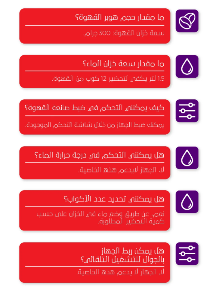 ● إمكانية إعداد وتخصيص القهوة المفضلة لديك، وتحديد عدد الأكواب.